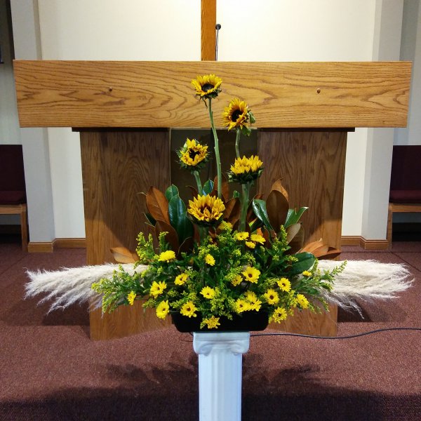소제 : Glass Pampas (갈대), 해바라기, "Golden Glory" Solidago (노란), 소국, Magnolia (Foliage Tips)매그놀리아 나무 잎사귀.