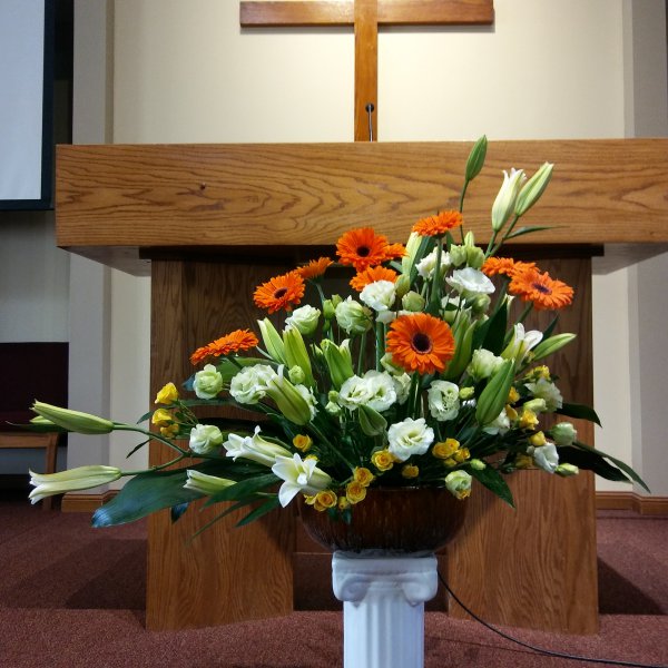 소재 : 하얀백합, 하얀 리시안셔스, 주황색 거베라 ( 소망과 주님의 크신 위로를.... )