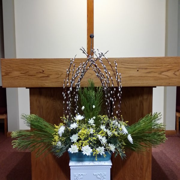 재료: 버들강아지, 국화(흰색), Green(Berzelia), Filler( 아카시아/Mimsoa Yellow)